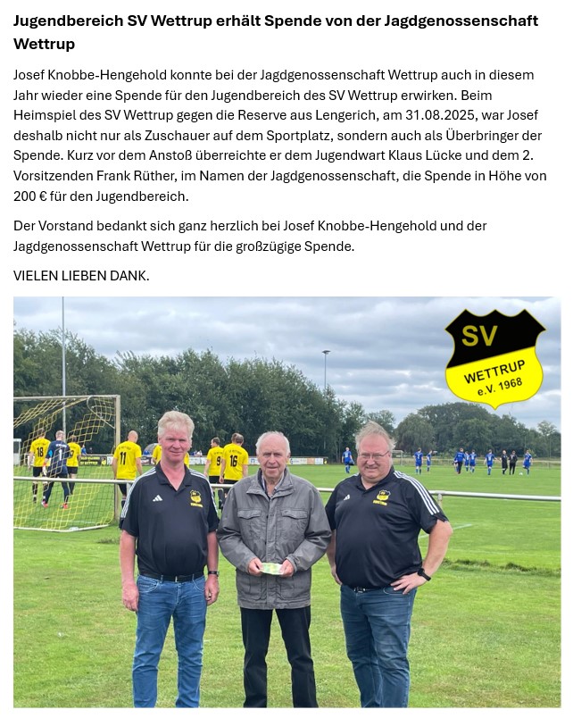 Beitrags-Navigation Sportwoche SV Wettrup 2025 Neue Trikots für die D-Juniorinnen der JSG Wettrup/Lengerich-Handrup